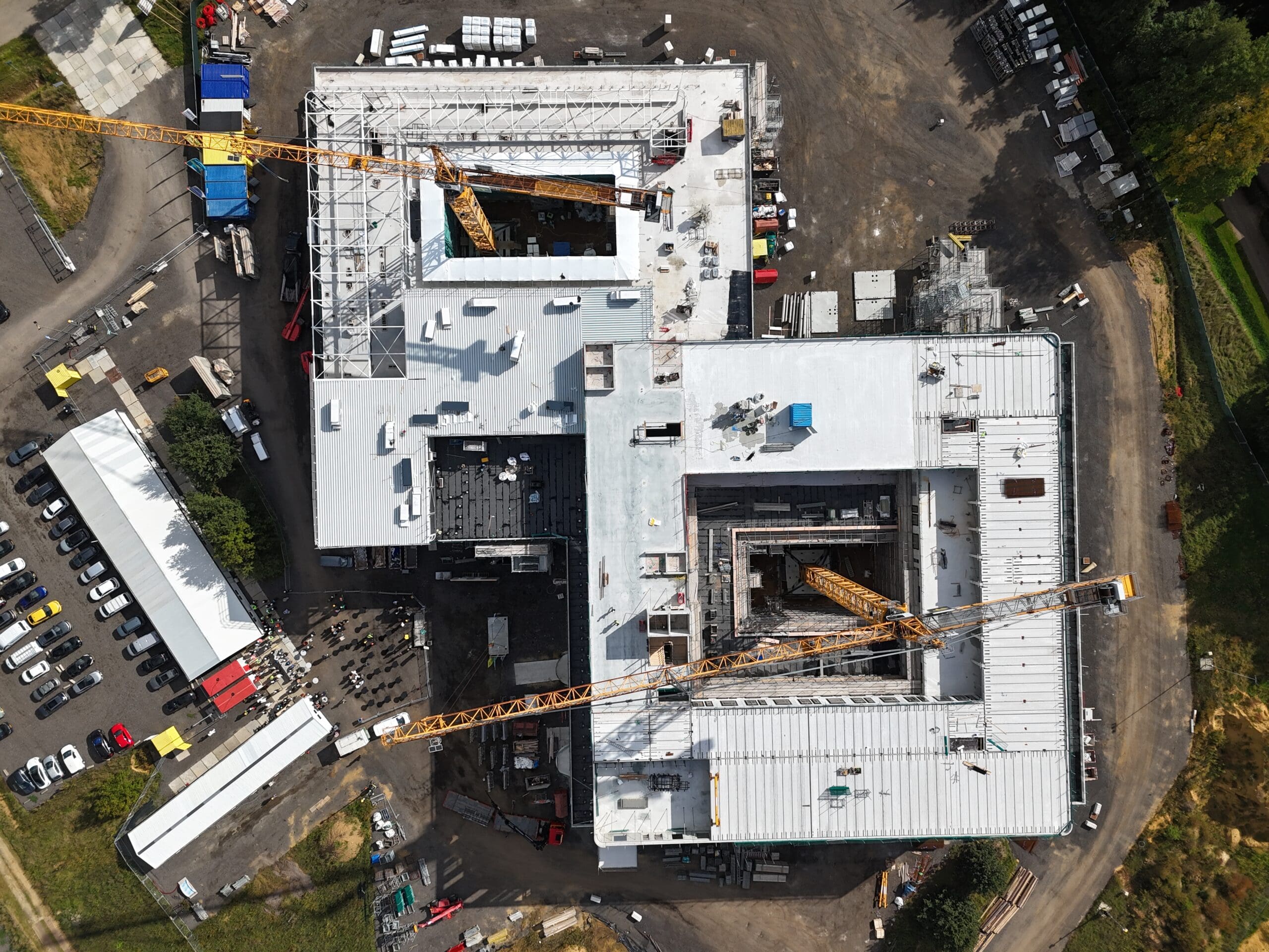 “We bouwen hier een volledig nieuw ziekenhuis met operatiekamers, poliklinieken, intensive care en verpleegafdelingen. Eigenlijk alles wat in een gangbaar ziekenhuis zit”, vertelt Tom. Het ziekenhuis krijgt een vloeroppervlak van 32.000 m2 en bestaat uit twee vierkante gebouwen die in elkaar verweven zijn. “Het nieuwe ziekenhuis lijkt een stuk kleiner dan het oude. Dat komt vooral omdat het veel compacter is door een slimmere indeling. Het voorste gedeelte van het gebouw noemen wij de hotfloor, hier zitten alle operatiekamers, de intensive care en spoedeisende hulp. Door de slimme indeling van de zorgafdelingen zijn de looprouters veel meer verkort, hierdoor kunnen we dus compacter bouwen. Het achterste deel is het hotelgedeelte, met algemene ruimtes, poliklinieken, verpleegkamers en kantoren.” In totaal krijgt de hotfloor drie bouwlagen en bestaat het hotelgedeelte uit vijf bouwlagen. Op het dak krijgen de technische ruimtes hun plek.
