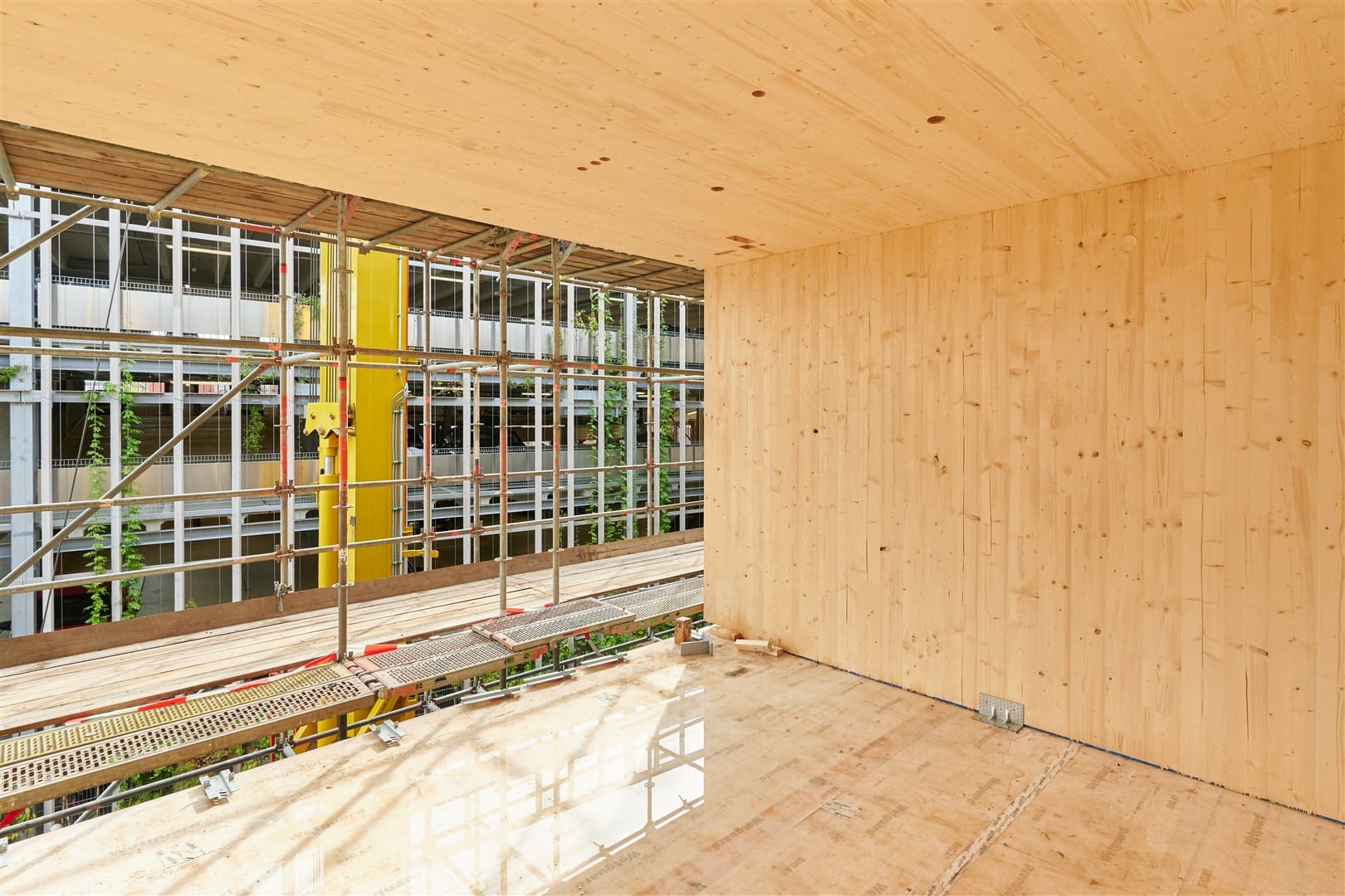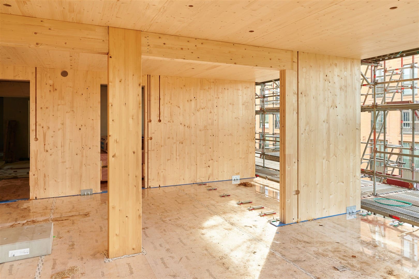 CLT is een milieuvriendelijk, sterk en licht bouwmateriaal. Door de kruislings verlijmde lagen hout ontstaat een robuuste en stabiele constructie, die tegelijk ecologisch verantwoord en energie-efficiënt is. Naast een kortere bouwtijd biedt CLT een duurzame oplossing voor comfortabel wonen. De draagconstructie van dit gebouw bestaat grotendeels uit hout. Er komen houten vloeren en wanden, met daaromheen een gevel van baksteen. De houten plafonds blijven zichtbaar en dat zorgt voor een warme uitstraling in de appartementen.