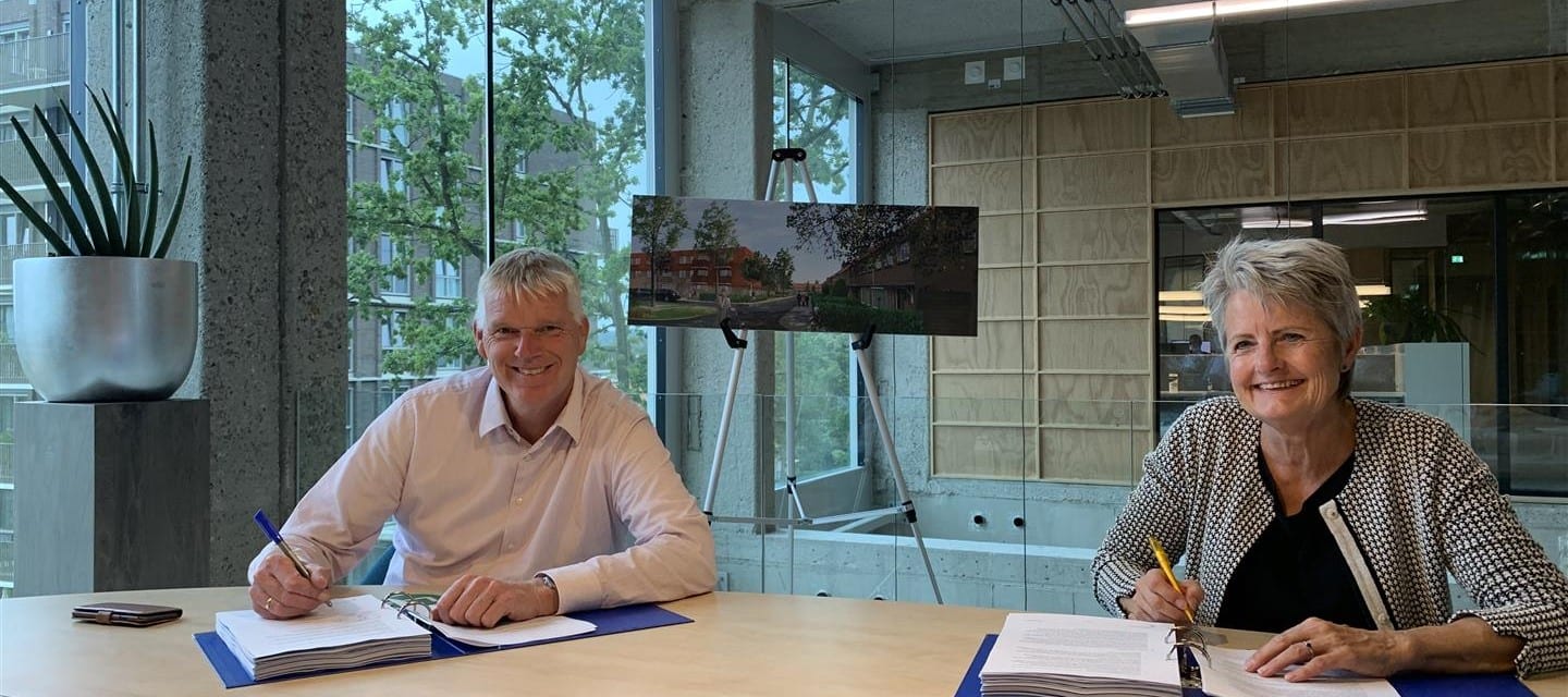 8 september jl. ondertekenden Jan van Barneveld, directeur bij de Alliantie Ontwikkeling en Antje de Groot-Schuttert, directeur bij Trebbe, de overeenkomst voor de ontwikkeling en realisatie van 9 eengezinswoningen en 25 appartementen aan de Lieven de Keylaan in Hilversum. Alle in het sociale huursegment.
