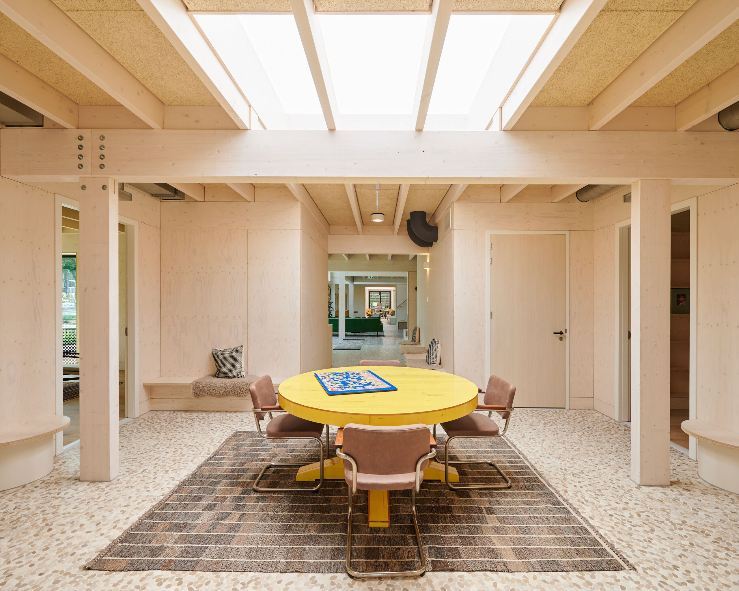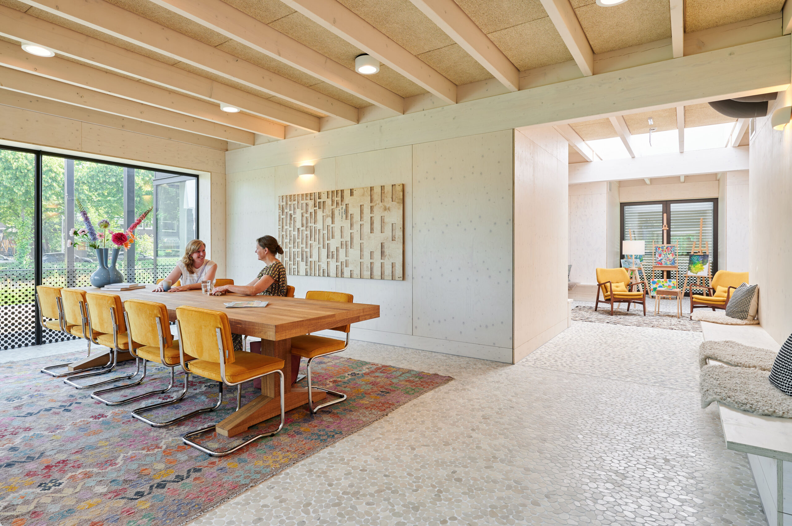 Het Maggie’s Center bestaat uit een stelsel van ruimtes die verschillende functies hebben. De ruimtes kunnen intiem als stiltekamer of informeel worden gebruikt voor 1-op-1 contact. Ook kunnen deze ruimtes aan elkaar worden gekoppeld.