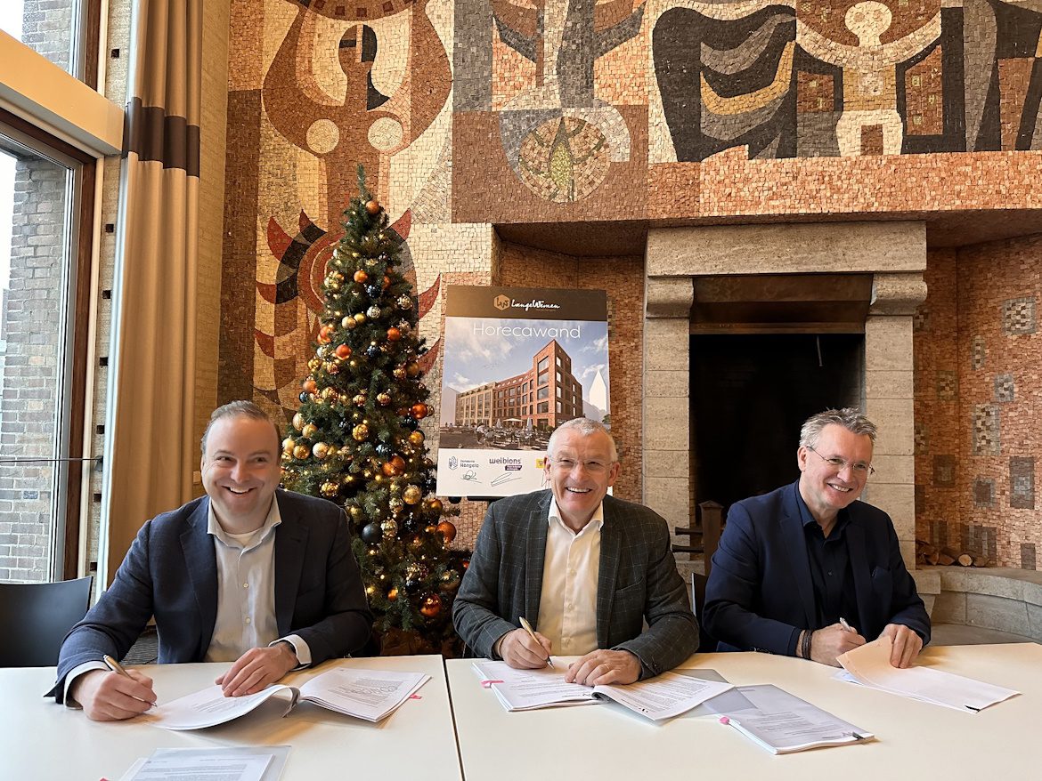 Hengelo krijgt er 39 energiezuinige huurappartementen bij in de nieuwe horecawand, tegenover het stadhuis. Het plan bestaat uit 31 sociale huurappartementen, 8 middenhuurappartementen en circa 720 m2 horecaruimte op de begane grond. Vandaag hebben woningcorporatie Welbions, bouwbedrijf Trebbe en gebiedsontwikkelaar VanWonen hiervoor op het stadhuis de handtekeningen gezet, in aanwezigheid van de Hengelose wethouder Gerard Gerrits.