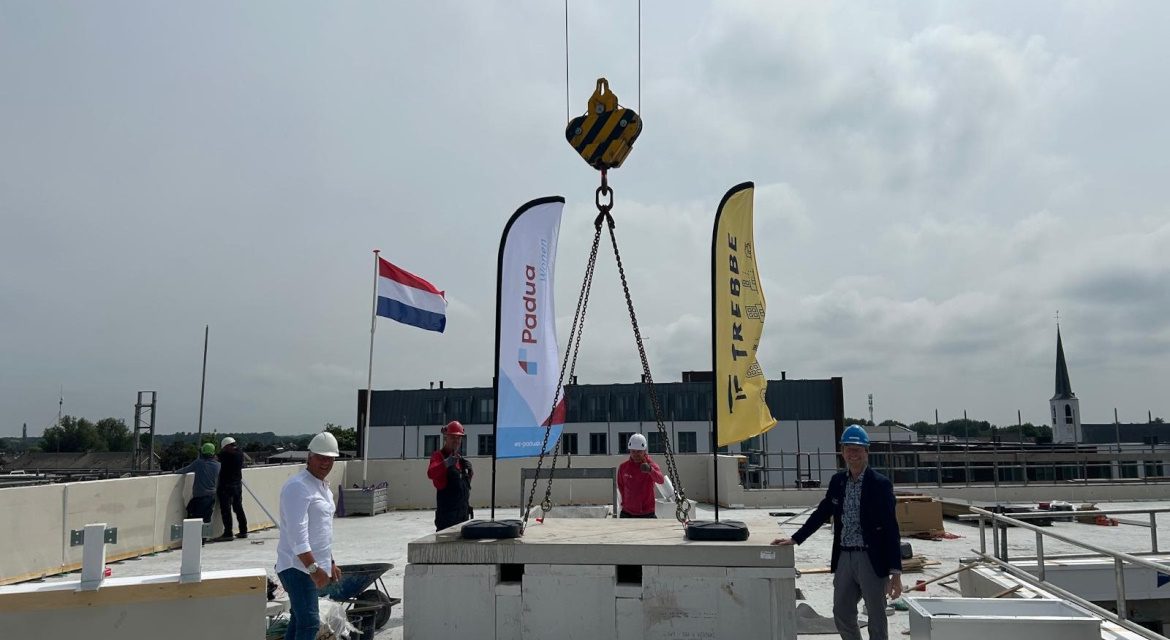 Het bereiken van het hoogste punt is een belangrijke traditie in de bouw, die Trebbe graag in ere houdt. Deze mijlpaal ging dan ook niet onopgemerkt voorbij. Samen met een afvaardiging van woningcorporatie Padua, Trebbe en alle betrokken bouwplaatsmedewerkers werd het hoogste punt feestelijk gemarkeerd door het plaatsen van de dakplaat op de liftschacht.