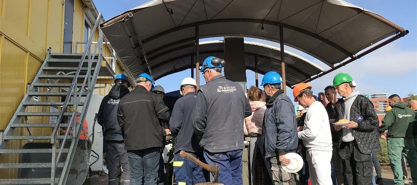 Van oudsher is het bereiken van het hoogste punt een moment om feestelijk aandacht aan te geven. Geheel in die traditie hesen Jan Jaap Vogel, directeur vastgoed bij Nijestee, en Antje de Groot, directeur bij Trebbe, vandaag de vlag in de top onder toeziend oog van circa zeventig bouwplaatsmedewerkers. Aansluitend volgde een feestelijke lunch op de bouwplaats. Jan Jaap Vogel, directeur vastgoed Nijestee: “Als Nijestee hebben we de ambitie om voldoende betaalbare woningen te hebben in de stad Groningen. Daar hebben we naast goede ideeën, bouwlocaties en geld, ook goede vakmensen voor nodig. We zijn dan ook erg trots op alle medewerkers die bijdragen aan de realisatie van Lampisterie. Dankzij hen hebben we dit hoogste punt bereikt.” Antje de Groot, directeur Trebbe: “Het hoogste punt van Lampisterie is een belangrijke mijlpaal. Het is het bewijs van de goede en intensieve samenwerking tussen alle betrokken partijen en daar ben ik buitengewoon blij mee.”