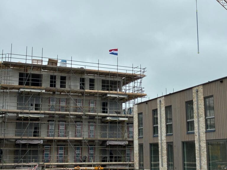 Het bereiken van het hoogste punt is een bijzonder moment op de bouwplaats. Volgens de traditie kon de vlag in top en er werd stilgestaan bij het werk van alle betrokkenen.