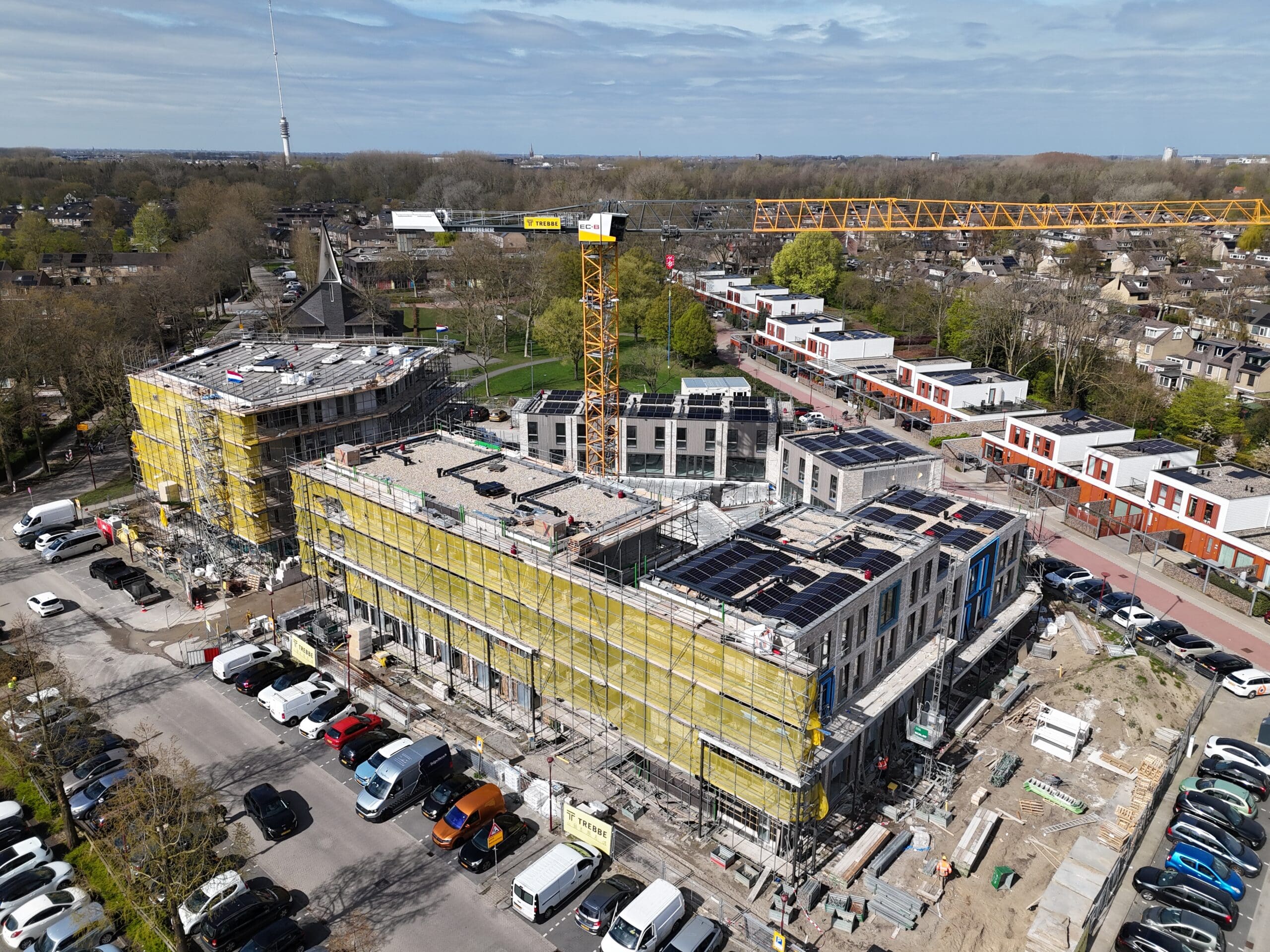Met het hoogste punt bereikt ligt de bouw op schema. De komende periode staat in het teken van de afbouw. Dit betekent dat er hard gewerkt wordt in de woningen en de appartementen. Zo worden binnenwanden geplaatst, het sanitair en tegelwerk wordt aangebracht, het metselwerk wordt afgerond én er wordt een start gemaakt met het aanleggen van de binnentuin.