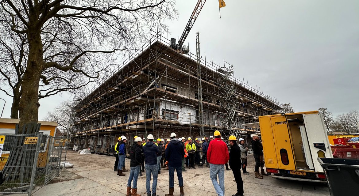 Het hoogste punt is een belangrijke mijlpaal binnen de bouw. Daarom werd volgens eeuwenoude traditie het hoogste punt gemarkeerd door de vlag in top te hijsen, onder toeziend oog van de mensen op de bouwplaats. Martin Meijer, Adviseur Vastgoed en Programmamanager Energetische Renovaties is blij. “Vandaag staan we stil bij het letterlijke toppunt van dit nieuwe gebouw. Maar het symboliseert voor ons ook een toppunt binnen Bouwstroom Noord. Dit is één van de eerste hoogbouwprojecten die we binnen deze samenwerking vormgegeven hebben. Het is mooi om te zien dat dit nu allemaal vorm krijgt in het gebouw. Je kunt zien dat er een goed voorbereidingstraject aan ten grondslag ligt en uitvoering verloopt erg soepel. We zijn heel tevreden.” Ook Niek van der Aa, senior projectmanager bij Trebbe is trots op deze mijlpaal. “Mijlpalen zijn er om even stil te staan bij al het werk dat verzet is. Ik ben trots op de mensen die hier op de bouwplaats in weer en wind bouwen aan duurzame en betaalbare woningen. Ook blikken we vooruit. Ik kijk uit naar de oplevering, rond de zomer krijgen de eerste bewoners al de sleutel.”