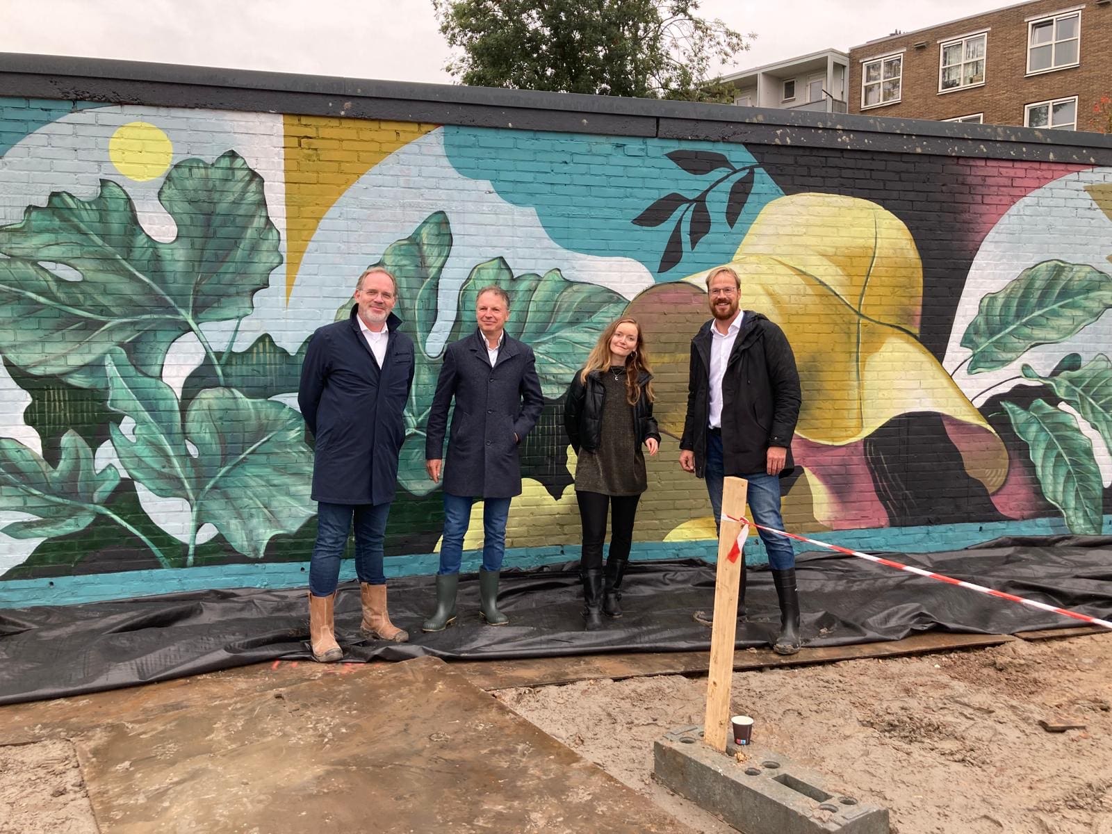 In Helpman-Noord in Groningen is de bouw van Jullenshof officieel gestart. Een bijzonder moment, want er worden niet iedere dag 50 woningen bijgebouwd midden in een populaire woonwijk. Om deze mijlpaal te markeren, onthulden wethouder Rik van Niejenhuis, Pieter Witzenburg, directeur vastgoed bij Lefier en Marinus den Harder, directeur bij Trebbe een muurschildering van kunstenares Roos Vink.
