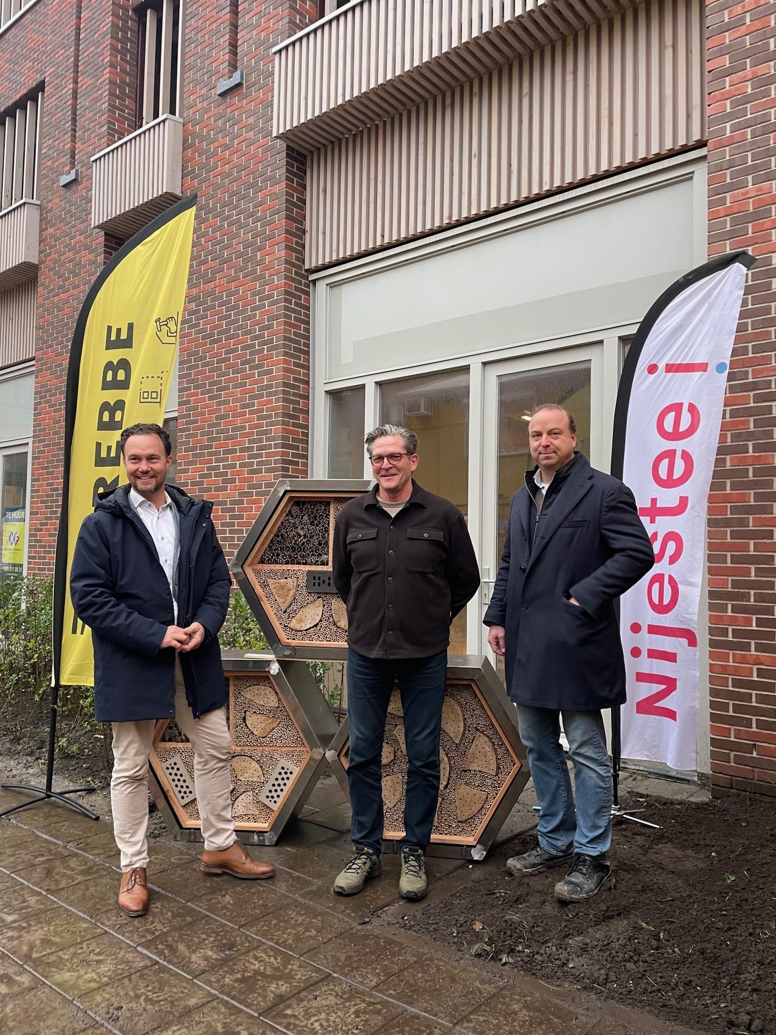 Vorige week vierde woningcorporatie Nijestee samen met bouwpartner Trebbe twee bijzondere momenten in de Grunobuurt: de eerste paal van woongebouw Couchette 1a en het bereiken van het hoogste punt van Couchette 1b. Daarmee komt een eind in zicht aan ruim twintig jaar wijkvernieuwing voor Nijestee. Onder de aanwezigen zijn Sander van der Tol, directeur-bestuurder van Nijestee, Hein Trebbe jr, directeur bij Trebbe, en Alfred Kazemier, directeur Stadsontwikkeling Gemeente Groningen.