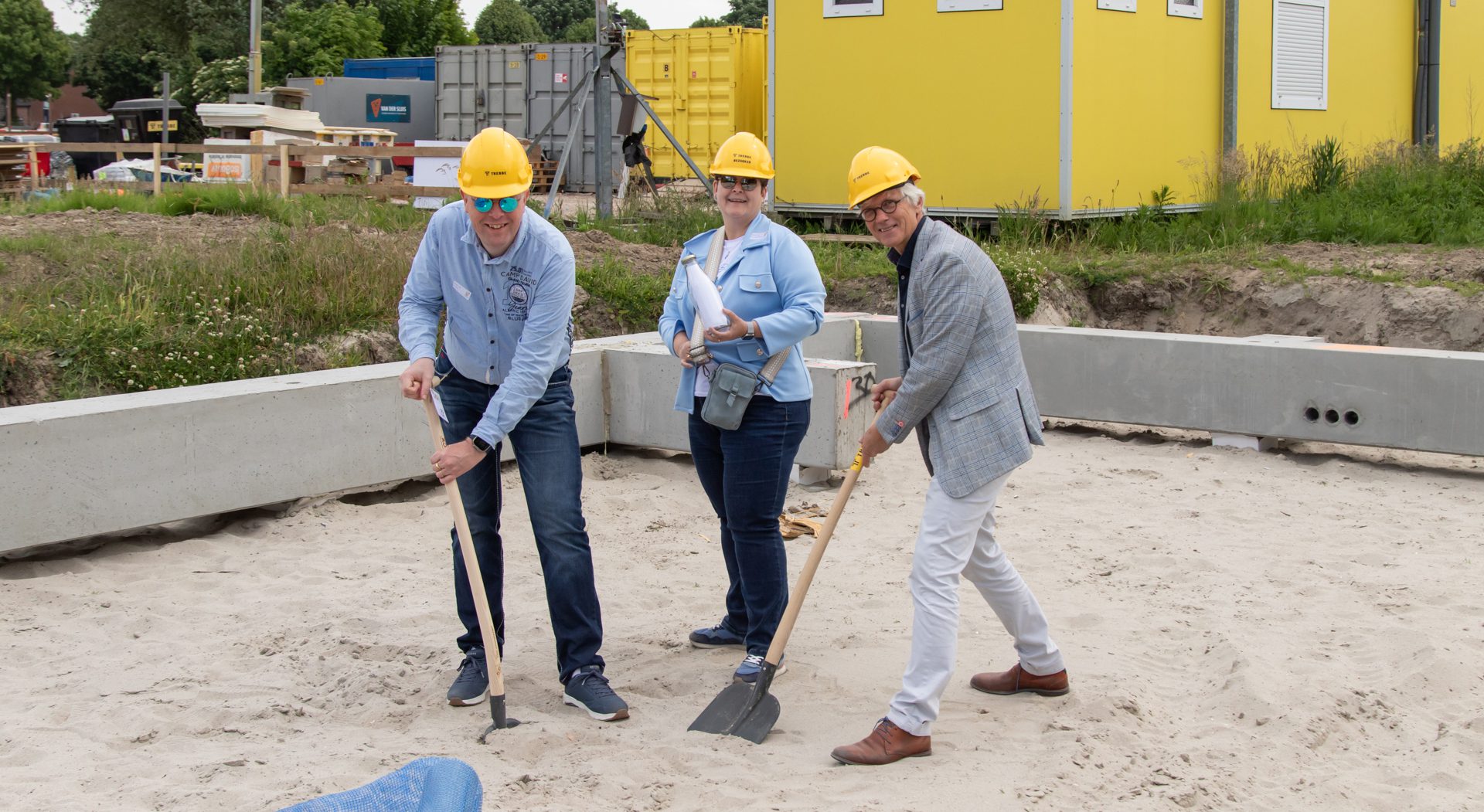 Op 21 mei is de bouw van 34 woningen fase 2A Zuiderweide Dronten gestart. Een bijzonder moment dat werd gevierd met de toekomstige bewoners. Hein Stooker, directeur bij Trebbe, begroef samen met hen tijdcapsules in de kruipruimte van de woningen, gevuld met persoonlijke verhalen, foto’s en wensen voor de wijk.