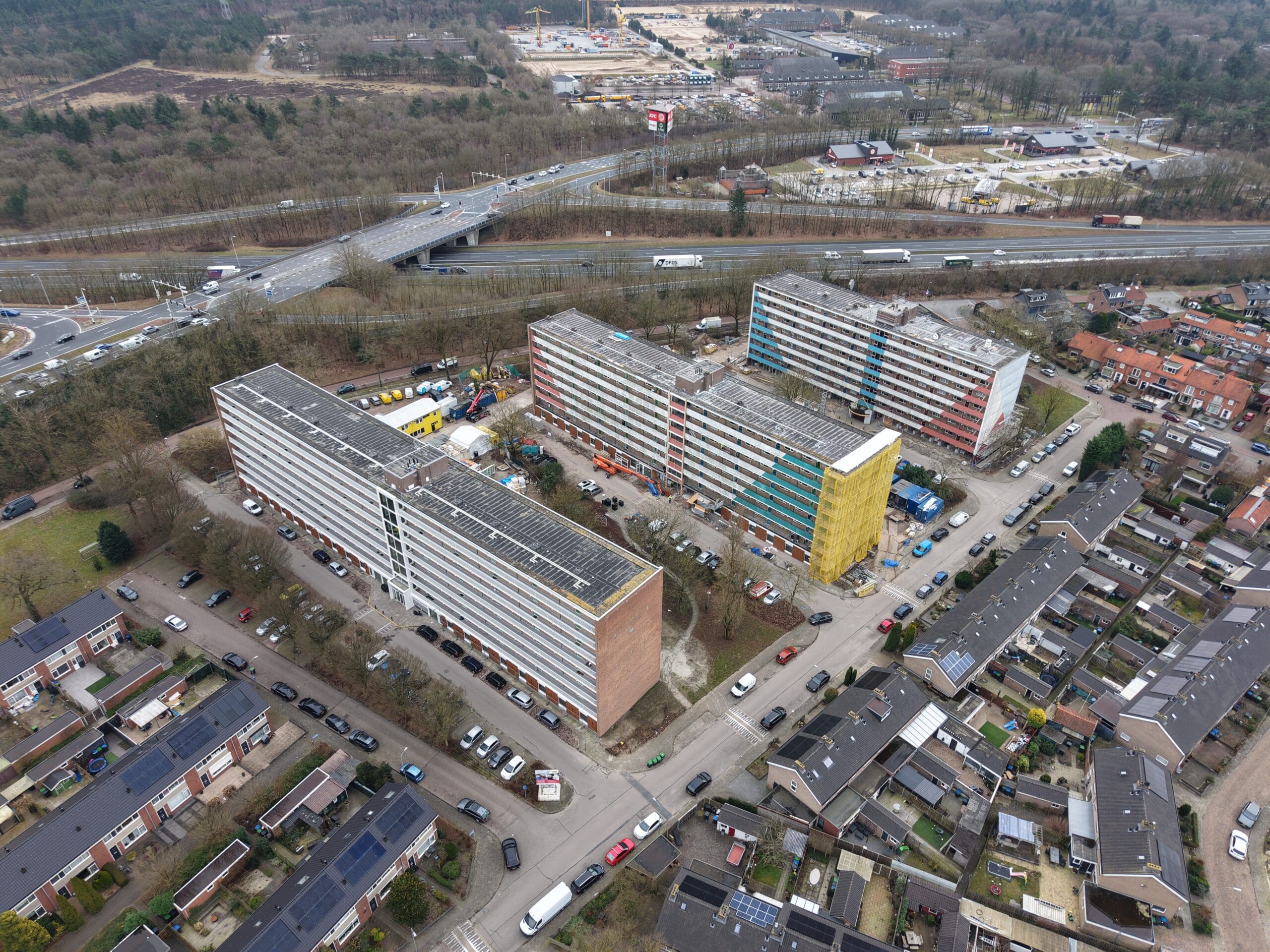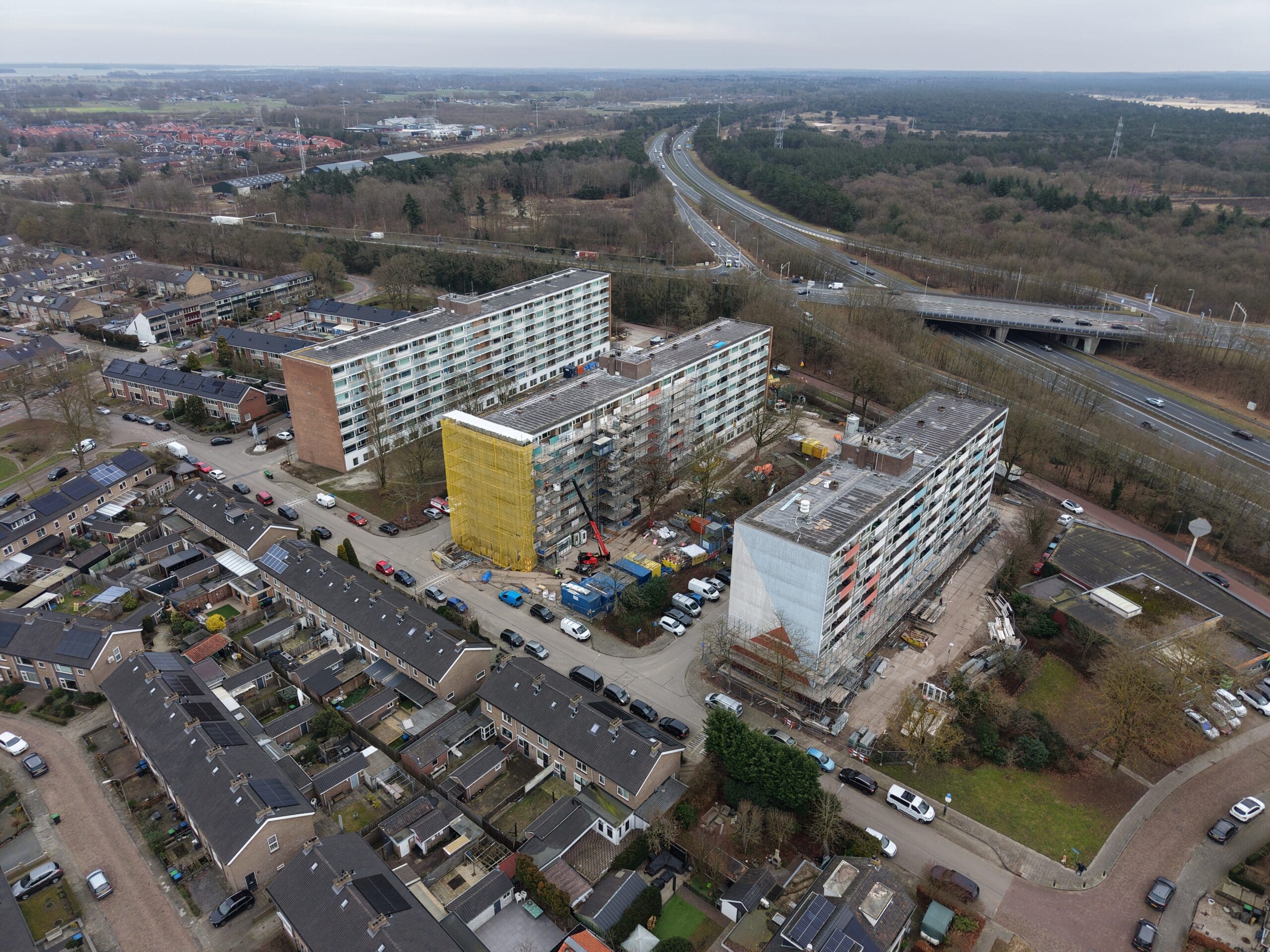 Aan de Goeman Borgesiuslaan in Harderwijk is een nieuwe mijlpaal bereikt in het groot onderhoud aan 189 appartementen, verdeeld over drie flatgebouwen van woningcorporatie Uwoon. Na bijna anderhalf jaar bouwen is dit omvangrijke project voor de helft gereed. En dat werd gevierd met een symbolisch hoogste punt op de bouwplaats.