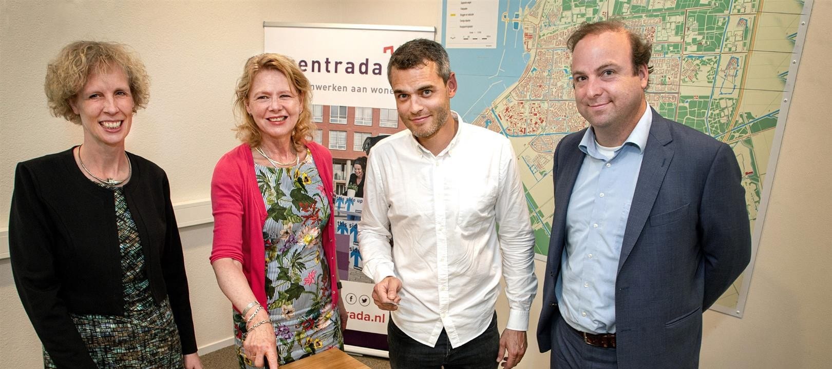 Dinsdag 18 juni ondertekenden Janneke Sparreboom wethouder gemeente Lelystad, Martine Visser, directeur-bestuurder Centrada, Folkert Leijten, directeur Leyten en Hein Trebbe jr. directeur Trebbe de koopovereenkomst voor de grond onder 30 sociale en 55 beleggershuurwoningen in Kop De Veste in Lelystad.