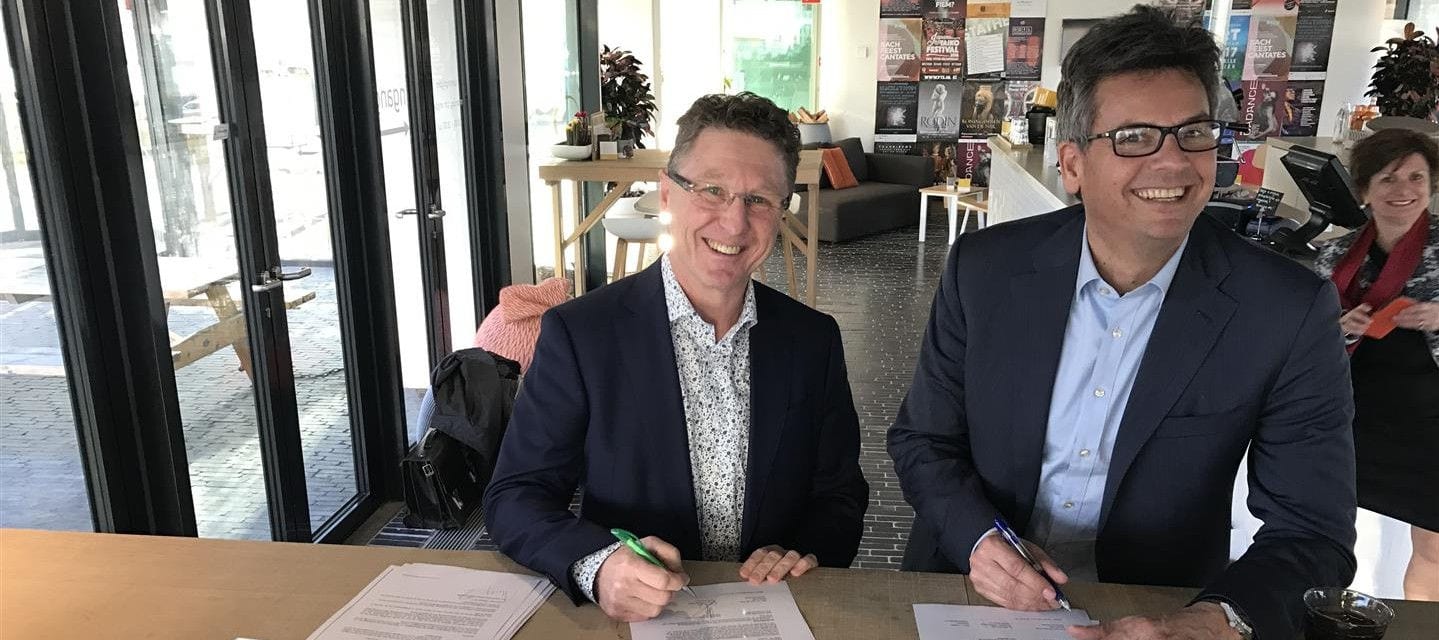 Onlangs ondertekenden de heer Dirk Jan van der Zeep, bestuursvoorzitter Portaal en de heer Rob van der Jagt, directeur Trebbe West, de overeenkomst voor de realisatie van 108 appartementen bestemd voor de sociale huur in de Nieuwegeinse wijk Blokhoeve.