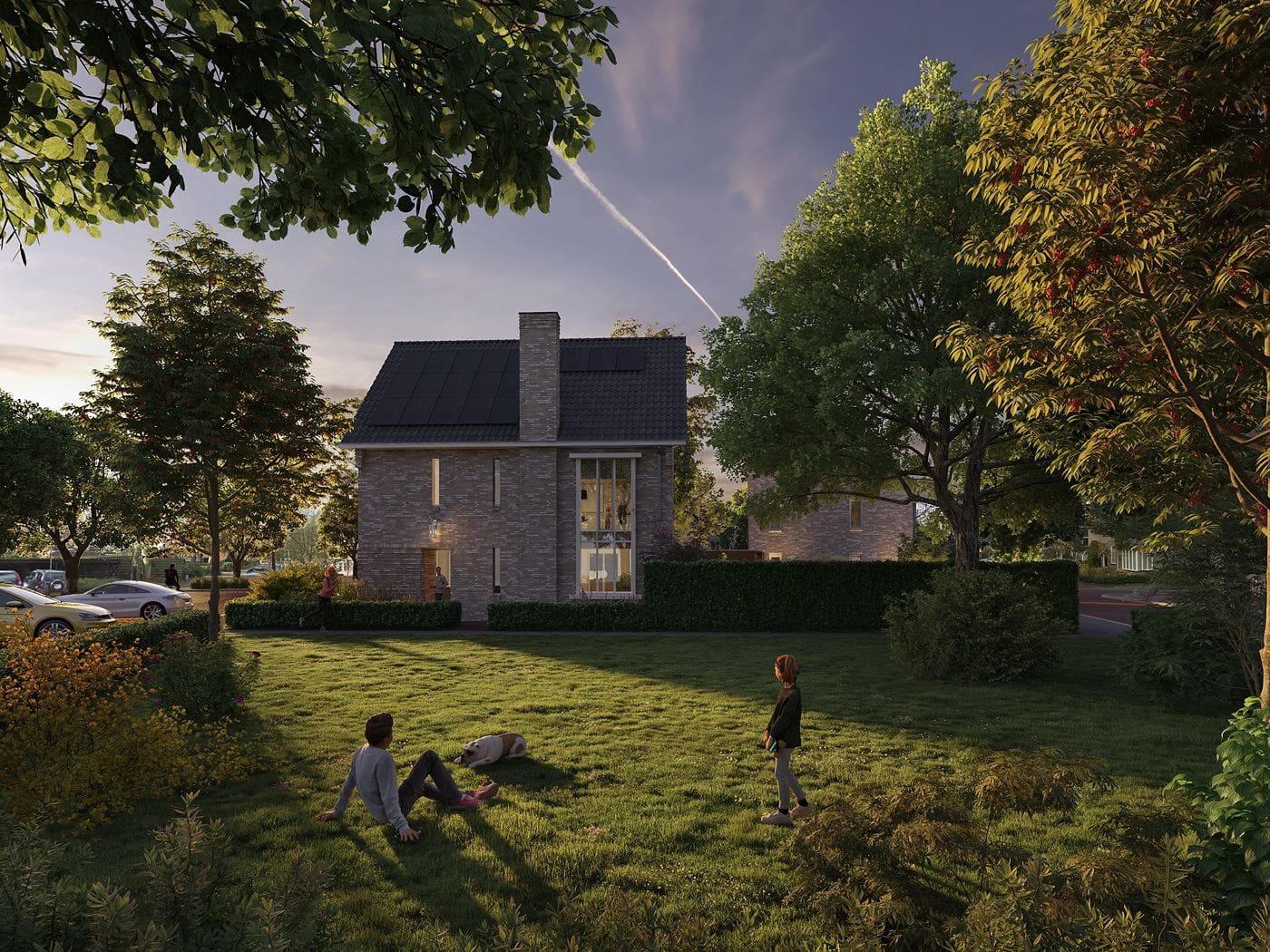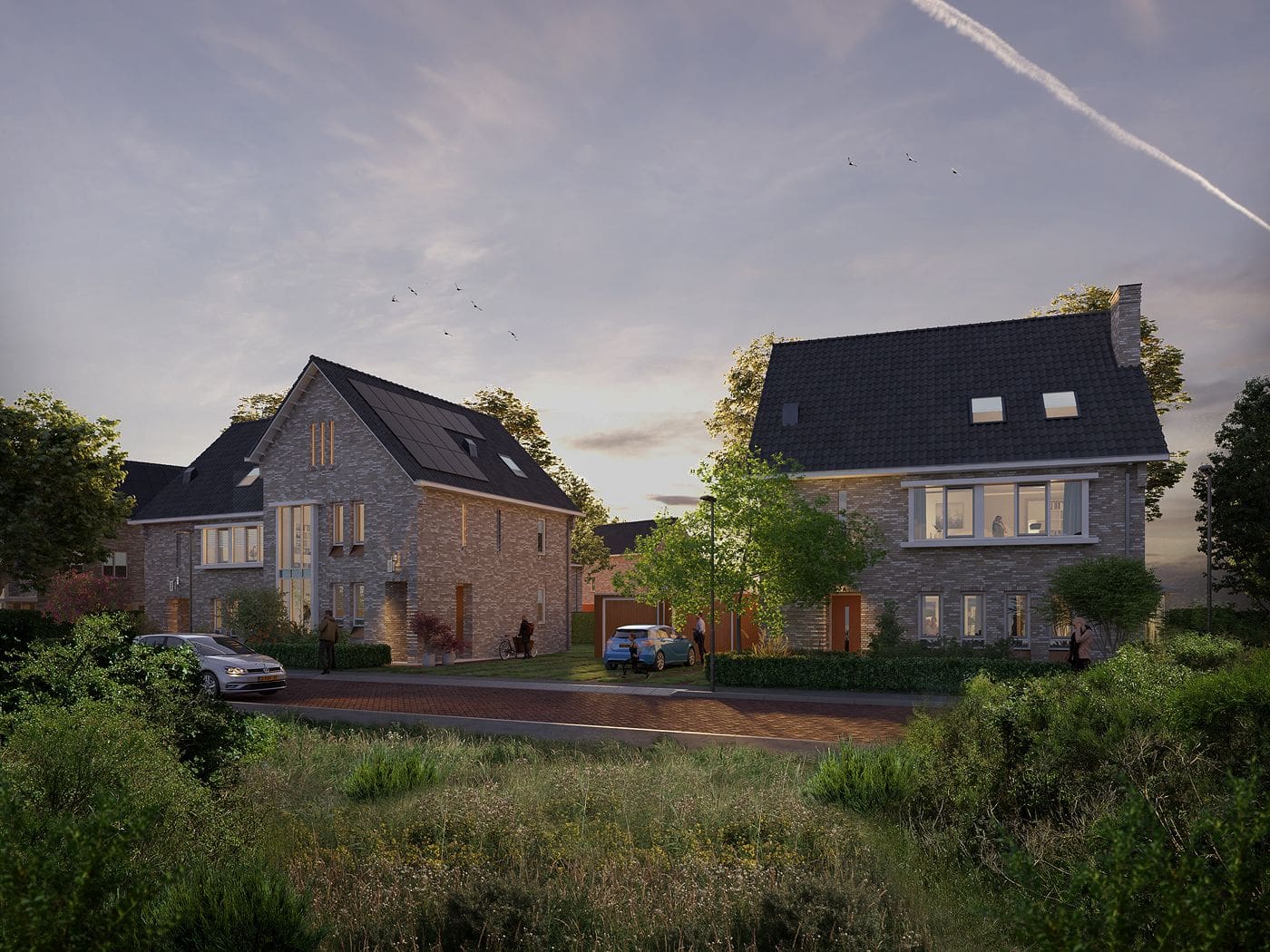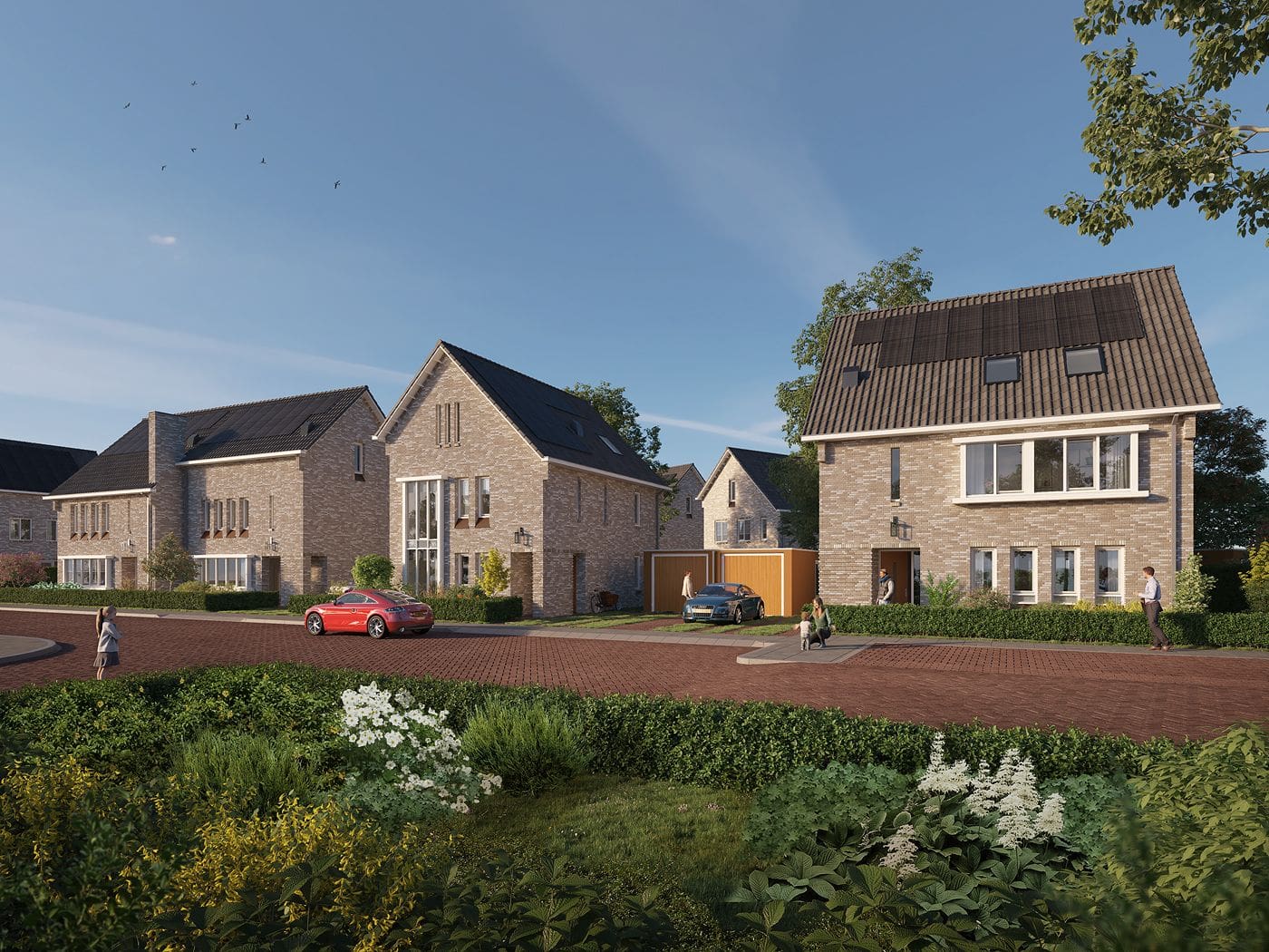 De 13 nieuwe woningen staan speels opgesteld waardoor lucht, groen en parkeren de ruimte krijgen. Elke woning heeft twee parkeerplaatsen naast elkaar op eigen terrein.