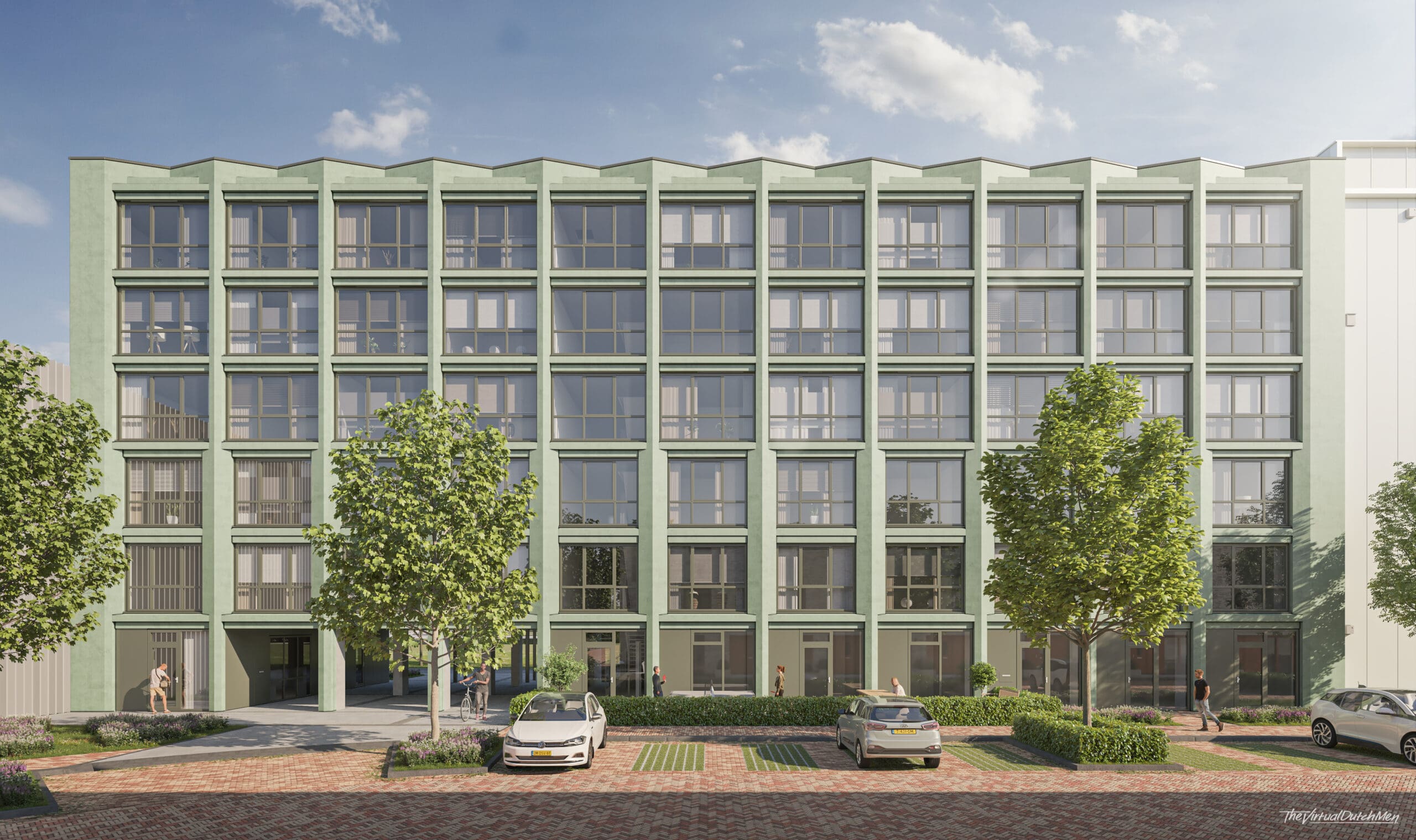 Het landschapsontwerp van Dijk&co landschapsarchitectuur zet volop in op duurzaamheid en biodiversiteit. Door de toepassing van inheemse beplanting wordt ruimte gecreëerd voor waterbeheer en lokale flora en fauna. De overgang met de waterpartij vormt een van de meest karakteristieke onderdelen van het plan, die leven en kleur toevoegt aan de buurt. Door de waterpartij te vergroten en regenwater af te voeren via wadi’s en groenvakken, wordt de wijk toekomstbestendig en klimaatadaptief. Het eigenzinnige landschapsontwerp zorgt voor een samenhangend geheel waarin alle gebouwen harmonieus zijn geïntegreerd.
