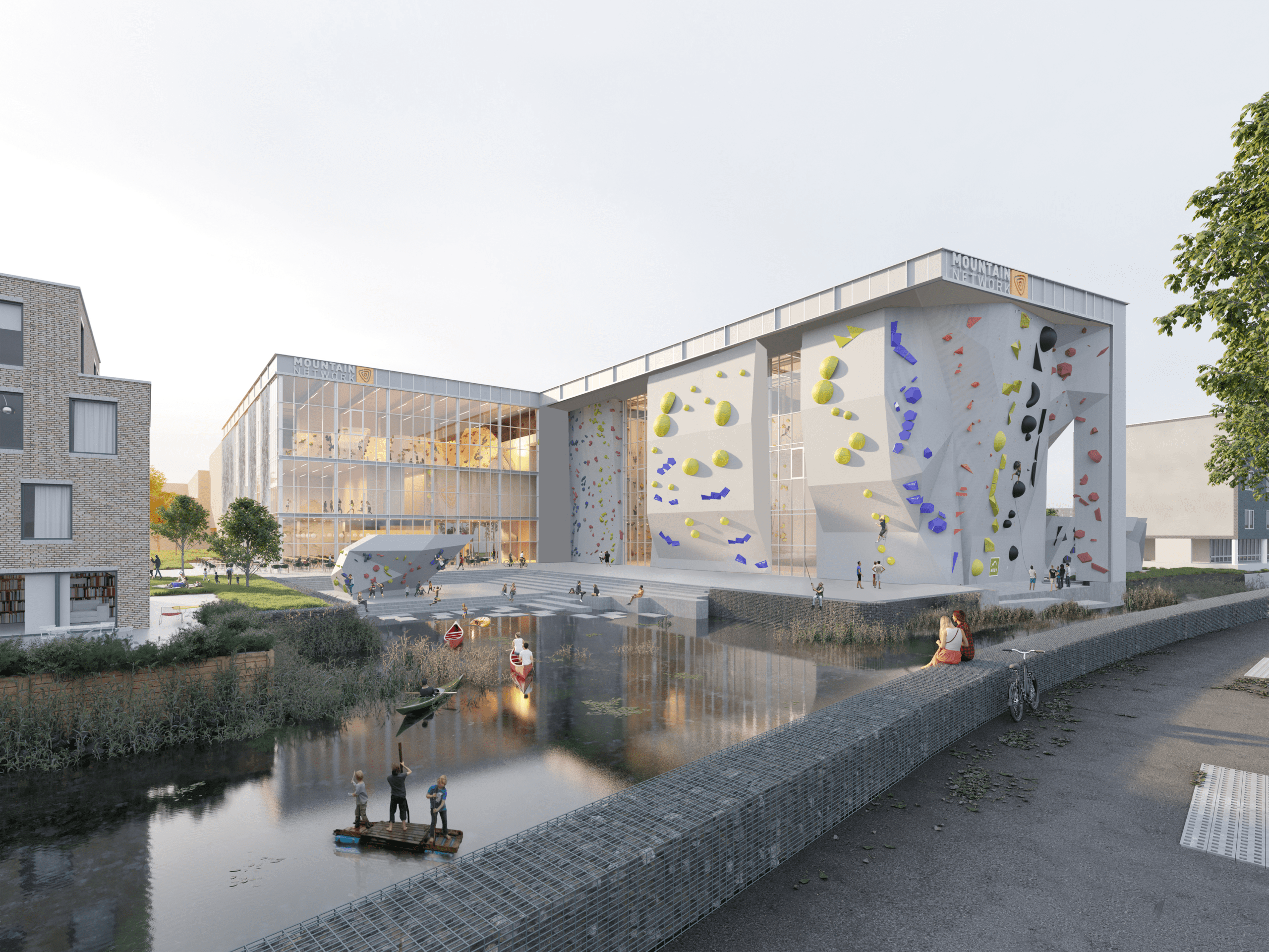 Voorzieningen Klim- en bergsportcentrum Mountain Network met glazen klimhal en aangrenzend plein. Aldi-supermarkt en SportCity fitnesscentrum.