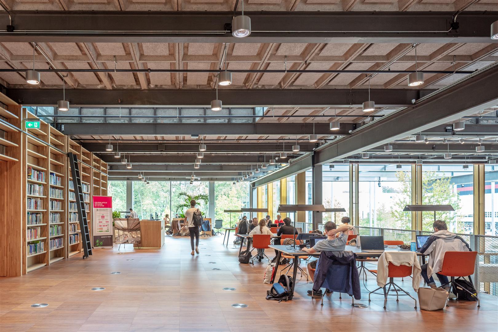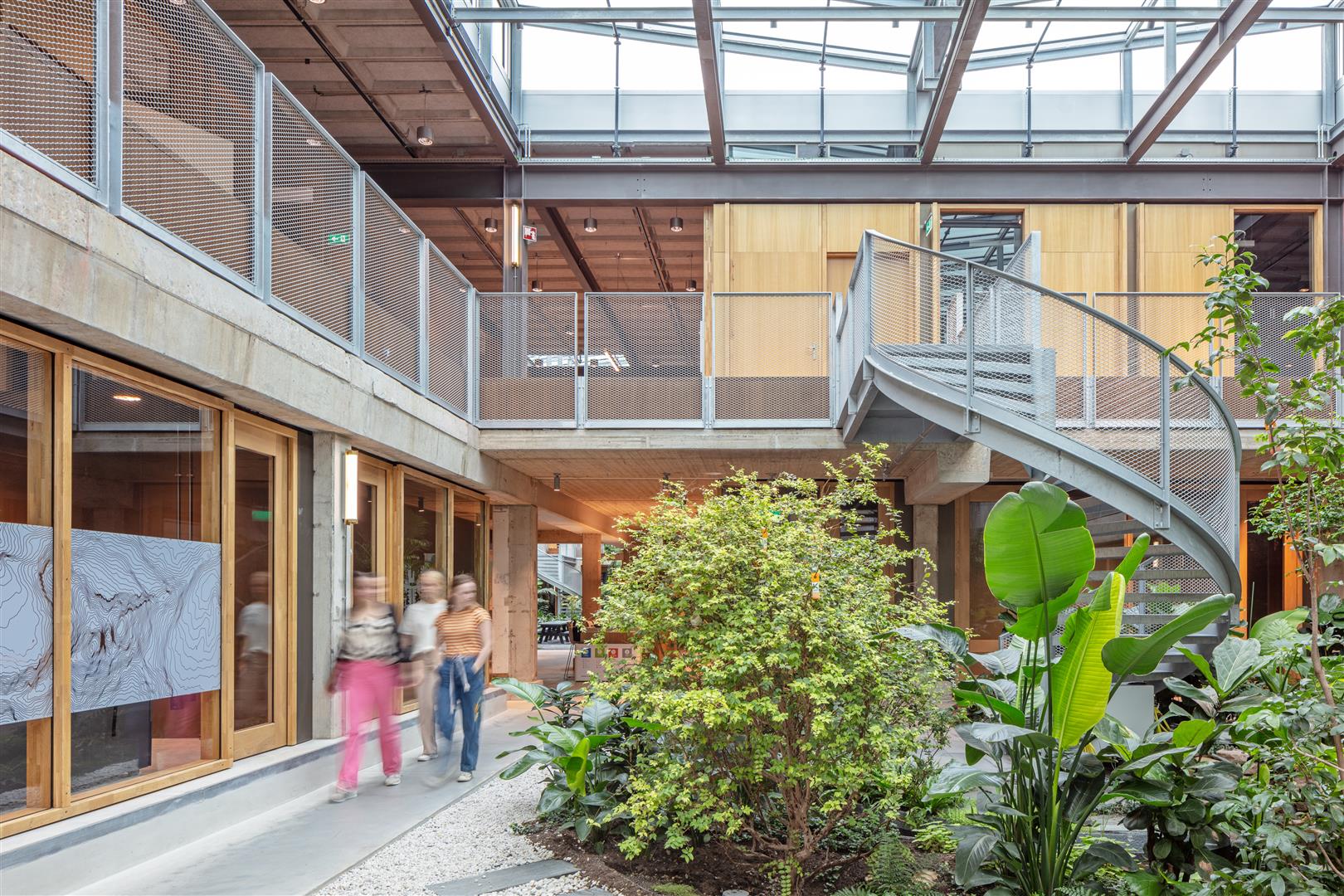De drie atria brengen daglicht en verse lucht in het gebouw, bieden plek bieden voor groen en dragen bij aan een duidelijke oriëntatie in het pand. Rondom de groene atria liggen de wetenschappelijke departementen. Onderwijsruimten, kantoren, laboratoria en studieplekken zijn gemengd. Tussen de atria en de gevel zijn open studielandschappen gesitueerd. Rond de entree liggen de meer publieke functies: een trap annex presentatieruimte, het restaurant en de bibliotheek. De begane grond biedt gebruikers ruimten voor concentratie. Op de verdieping liggen de grotere vertrekken en is er ruimte voor ontmoeting. Een brede binnenstraat verbindt hier alle ontmoetingsplekken.