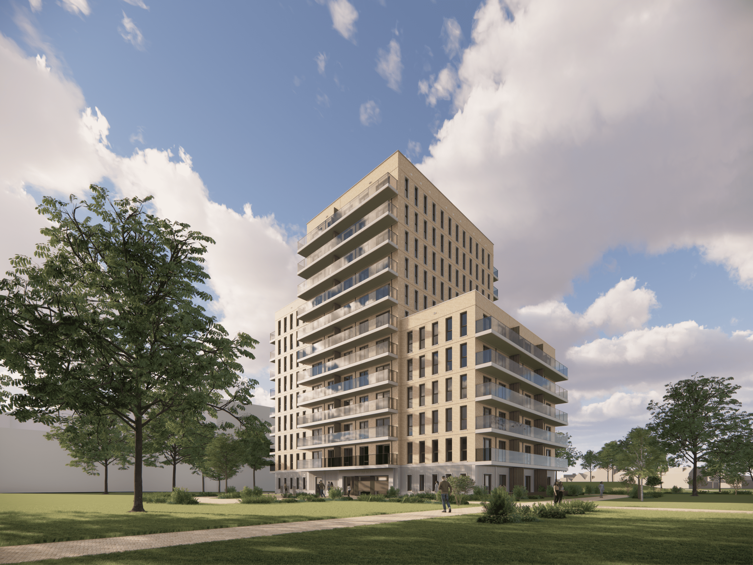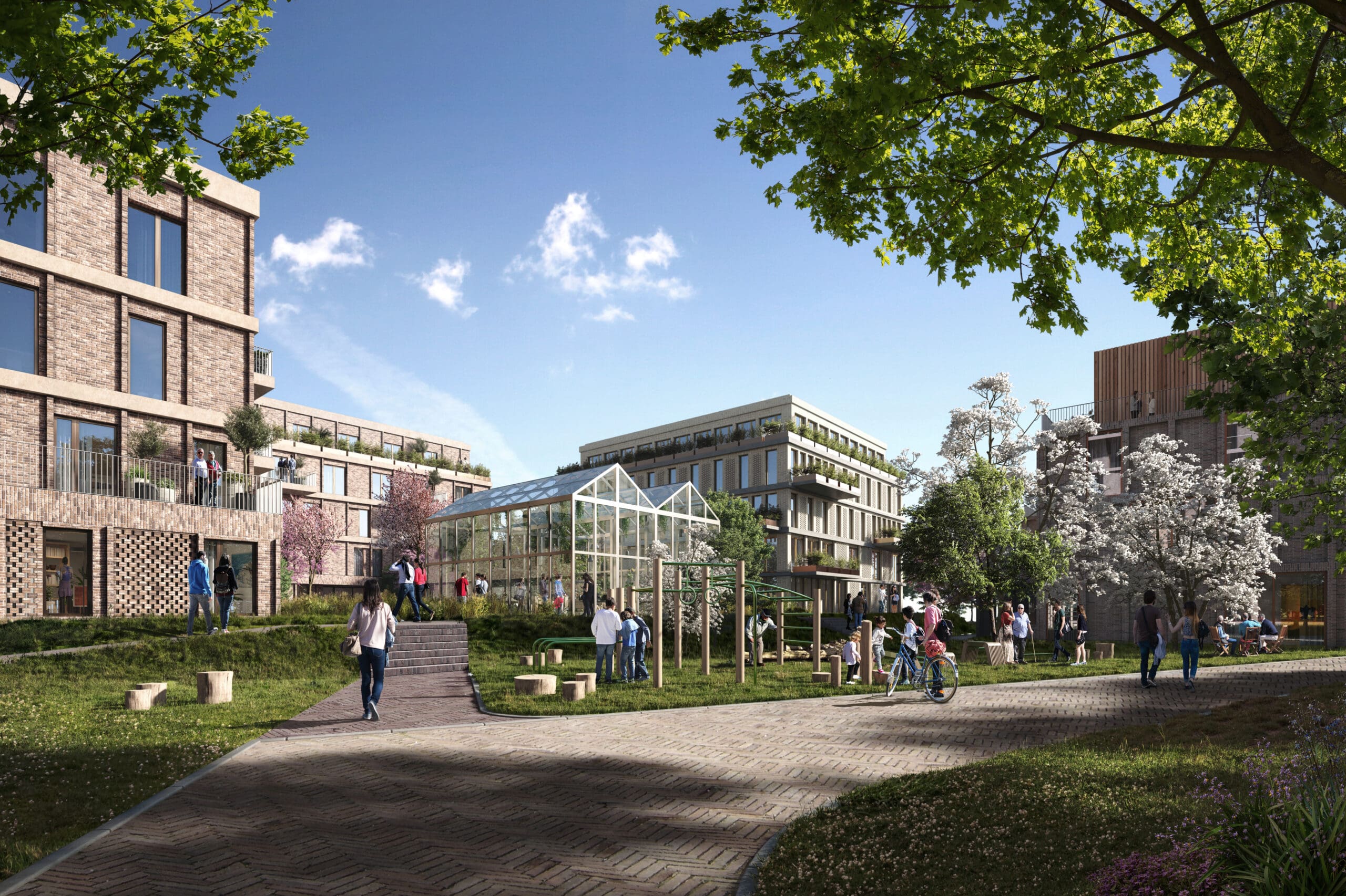 Nieuwbouw totaal Circa 280 duurzame en gezonde woningen, verdeeld over vijf appartementengebouwen en meerdere grondgebonden woningen. Sociale huur, middenhuur en koop.