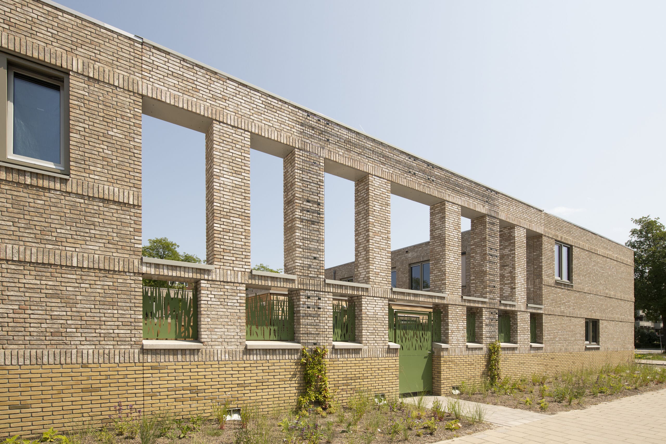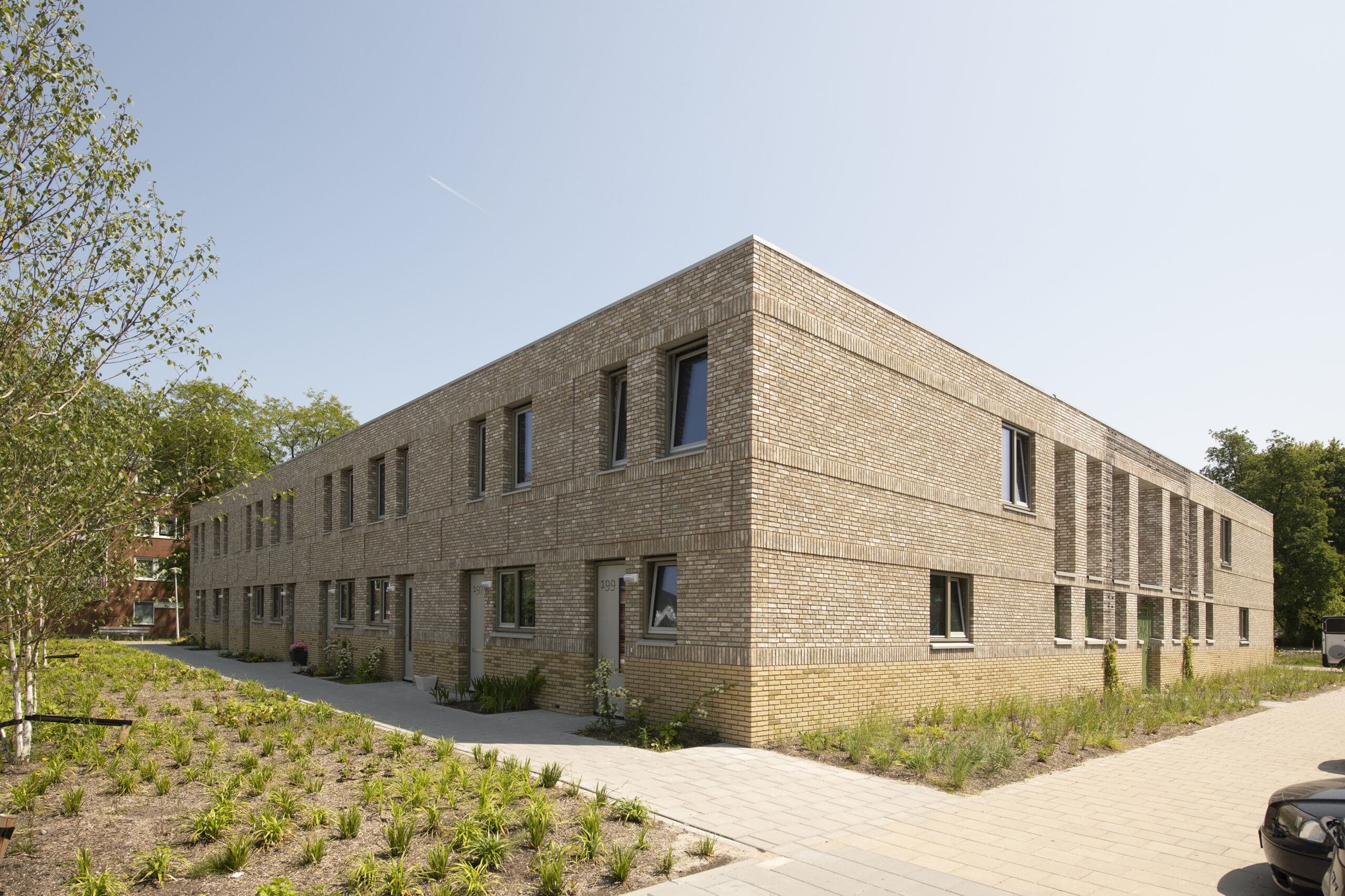 Zestien eengezinswoningen verdeeld over twee blokken van acht, naar ontwerp van SCP Architectuur en Stedenbouw. De gevel sluit aan op de stedenbouwkundige context en een hoge tuinmuur met tuinhek koppelt de korte rijen woningen aan elkaar.