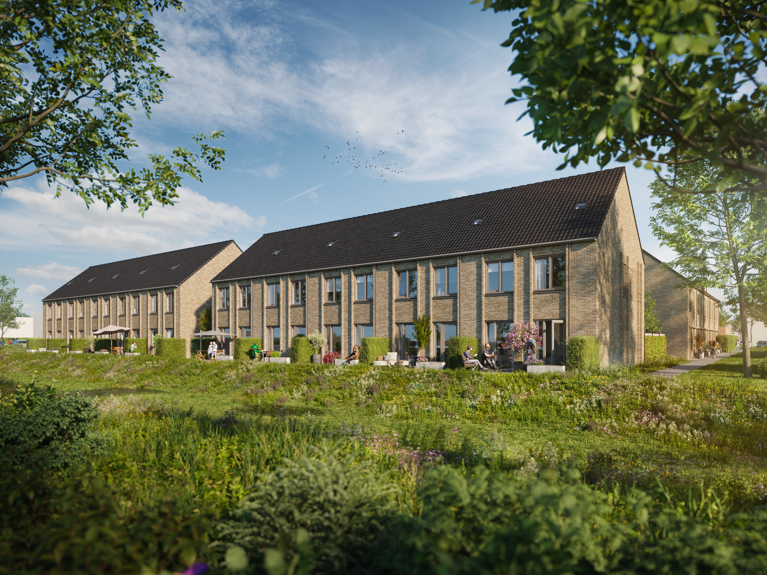 In Campus Driene bouwen we samen aan geluk. Hier hebben we aandacht voor de aarde, maatschappij, mens en continuïteit. Maar hoe doen we dat precies? Blue vertelt: ”Aan de aarde wordt gedacht door het behoud van de bomen, de flora en fauna en de wadi’s. Ook denken we aan de maatschappij door te bouwen voor een brede doelgroep. Een mix van koop en huur. We bedienen de hele markt. Zo bouwen we sociale huur, middenhuur, betaalbare koop, middeldure koop en luxe woningen. Aan de mens wordt gedacht door het creëren van verschillende hofjes waarin ontmoeten centraal staat. Tot slot hebben we aandacht voor de continuïteit door de samenwerking in dit unieke plan. De samenwerking met de gemeente en Leyten is ontzettend goed. We werken écht samen aan deze nieuwe leefomgeving. Daarnaast hebben we vanuit Trebbe een vast team. We wisten al bij de start wie onze uitvoerder ging worden. Daardoor konden we het hele uitvoeringsteam meenemen in het ontwerp en filosofie.”