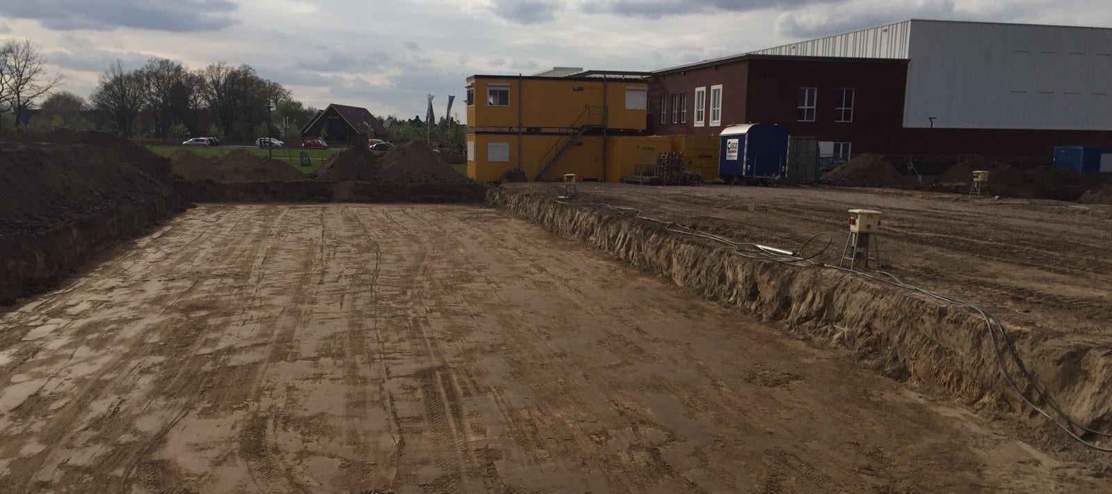 Met het ontgraven van de bouwput zijn de eerste activiteiten op de bouwplaats van de 16 zeer energiezuinige woningen in de Bornsche Maten te Borne zichtbaar en is de bouw van start gegaan.
