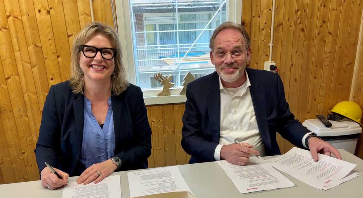 In Harderwijk krijgen de Goeman Borgesius flats een opknapbeurt. De werkzaamheden aan en in flat 1 zijn in volle gang. Als je blij met elkaar bent, dan ga je door. Daarom zetten Fleur Imming namens Uwoon en Marinus den Harder van Trebbe graag hun handtekening. Daarmee legden ze vast dat Trebbe ook de tweede en derde flat aan de Goeman Borgesiuslaan in Harderwijk flink gaat verbeteren.